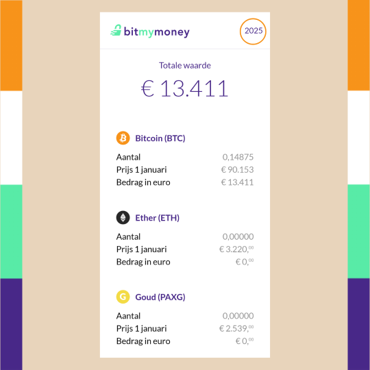 De waarde is het aantal munten dat je op 1 januari 2025 bezat, vermenigvuldigd met de koers van 1 januari 2025. Bitmymoney heeft dit al voor je gedaan. Dit overzicht staat klaar in je Bitcoinrekening.