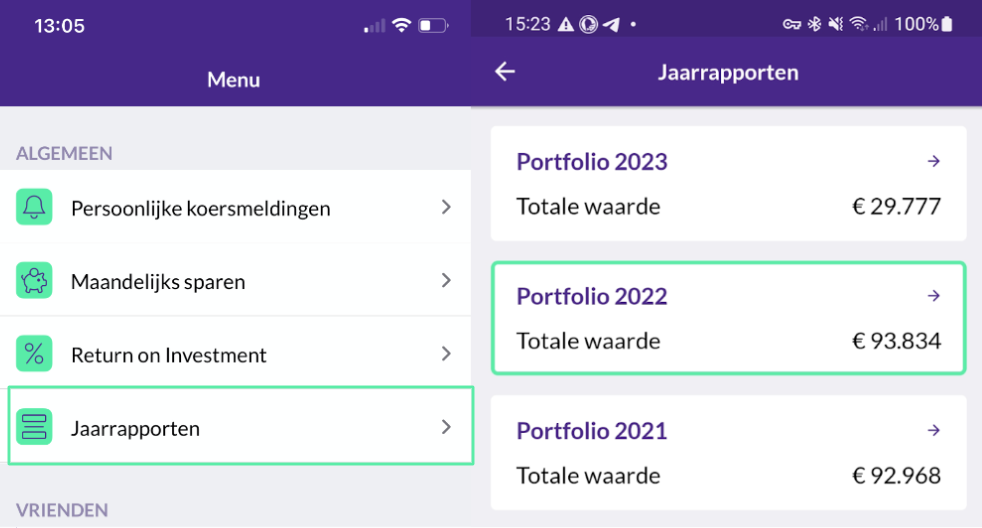 In de app vind je je gegevens in het menu onder ‘Jaarrapporten’. Je kunt de rapporten daar downloaden en gebruiken voor je administratie.