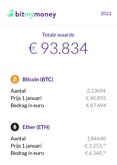 Je telt het aantal munten dat je op 1 januari bezat op, met de koers van 1 januari 2022. Zo kom je tot één eurobedrag voor de waarde van je portfolio. Je kunt dit zelf doen in een spreadsheet voor al je wallets en exchanges.