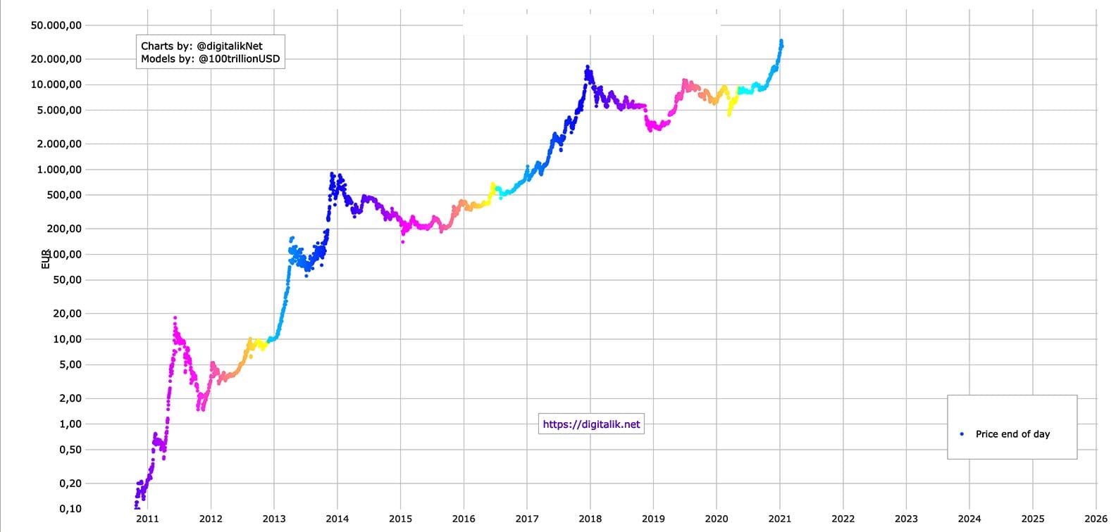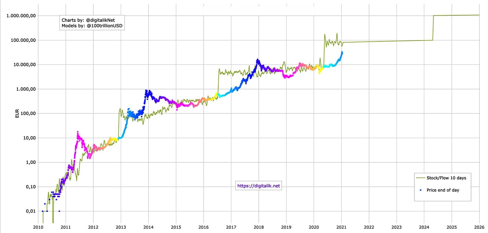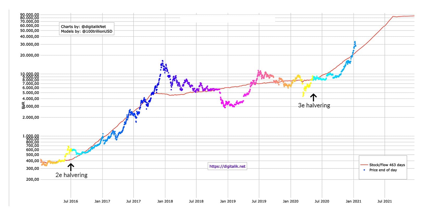 De Nederlander PlanB vond een functie die historisch de s2f van Bitcoin koppelt aan de prijs. Wanneer je een s2f waarde invult voor Bitcoin in de toekomst, krijgt het een voorspellend karakter. Zo voorziet het model een koers van €90.000 voor december 2021: