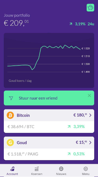 Net als Bitcoin kun je vanaf een bedrag van €10 goud kopen met iDEAL. Je kunt goud ook weer verkopen naar je bankrekening. Daarnaast kun je goud versturen naar je vrienden.