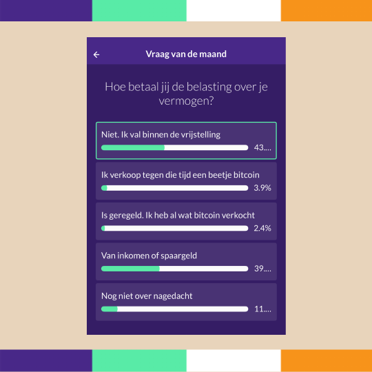 De poll laat zien dat onze gebruikers bitcoin echt als langetermijnreserve aanhouden. De meesten vallen binnen de vrijstelling of betalen de belasting liever van hun euro-spaargeld, zodat hun bitcoin-bezit intact blijft. Dat is de visie op vermogensopbouw die wij delen.