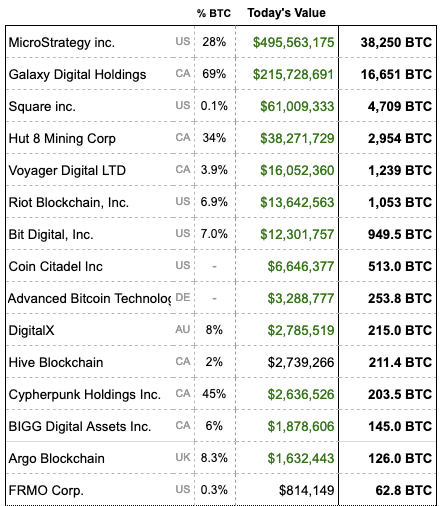 Het positieve sentiment in de eerste weken is goed te verklaren door het nieuws dat steeds meer bedrijven Bitcoin opnemen in hun eigen vermogen. Hieronder zie je een lijst met beursgenoteerde bedrijven en hun positie in Bitcoin.