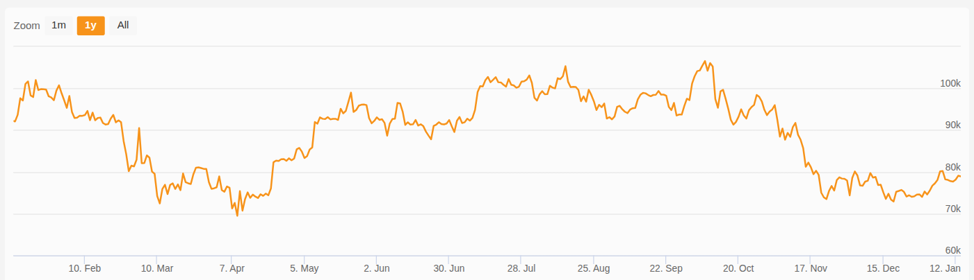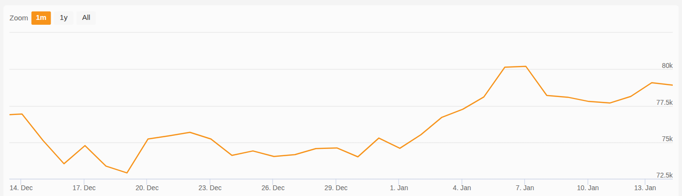 De Bitcoinkoers heeft een relatief rustige en stabiele maand achter de rug. De koers bij de aankoop van deze dinsdag (€ 78.829,93) lag 2,4% hoger dan precies een maand geleden.