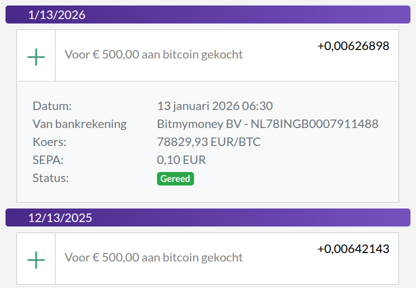 En wat betekent dit voor Satoshi's rekening? Precies zoals het bedoeld is. Door een vast bedrag per maand in te stellen, laat je je niet afleiden door schommelingen. Het zorgt ervoor dat je zowel op lagere als hogere momenten Bitcoin koopt, waardoor je een gezonde gemiddelde aankoopprijs opbouwt.