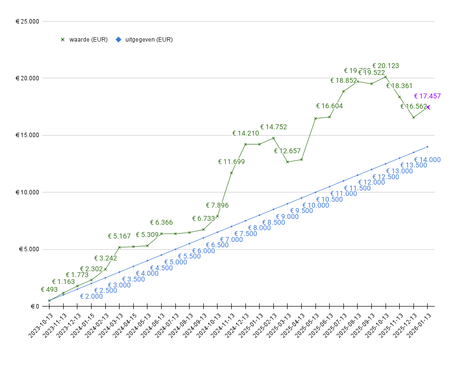 Door groei van ons Bitcoinbezit neemt de gevoeligheid voor koersschommelingen toe. Een kleine beweging in de koers heeft meer effect op de totale waarde dan onze maandelijkse inleg. Dit is iets waar je aan moet wennen. Het onderstreept de focus op de lange termijn; je laat je niet leiden door de dagkoers.