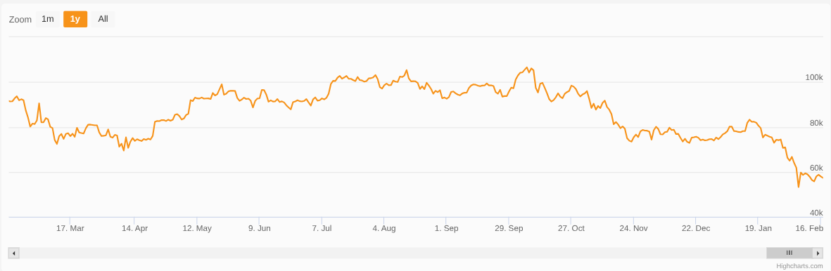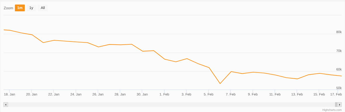 Na een rustige periode zagen we deze maand een flinke beweging omlaag. De koers bij onze aankoop van deze vrijdag (€ 55.670,00) lag 29,4% lager dan een maand geleden. Deze daling betekent dat we voor de maandelijkse inleg van 500 euro nu aanzienlijk meer Bitcoin krijgen.