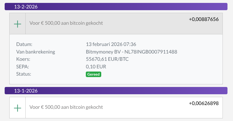 En wat betekent dit voor Satoshi's rekening? Precies zoals het bedoeld is. Door een vast bedrag per maand in te stellen, laat je je niet afleiden door schommelingen. Het zorgt ervoor dat je zowel op lagere als hogere momenten Bitcoin koopt, waardoor je een gezonde gemiddelde aankoopprijs opbouwt.