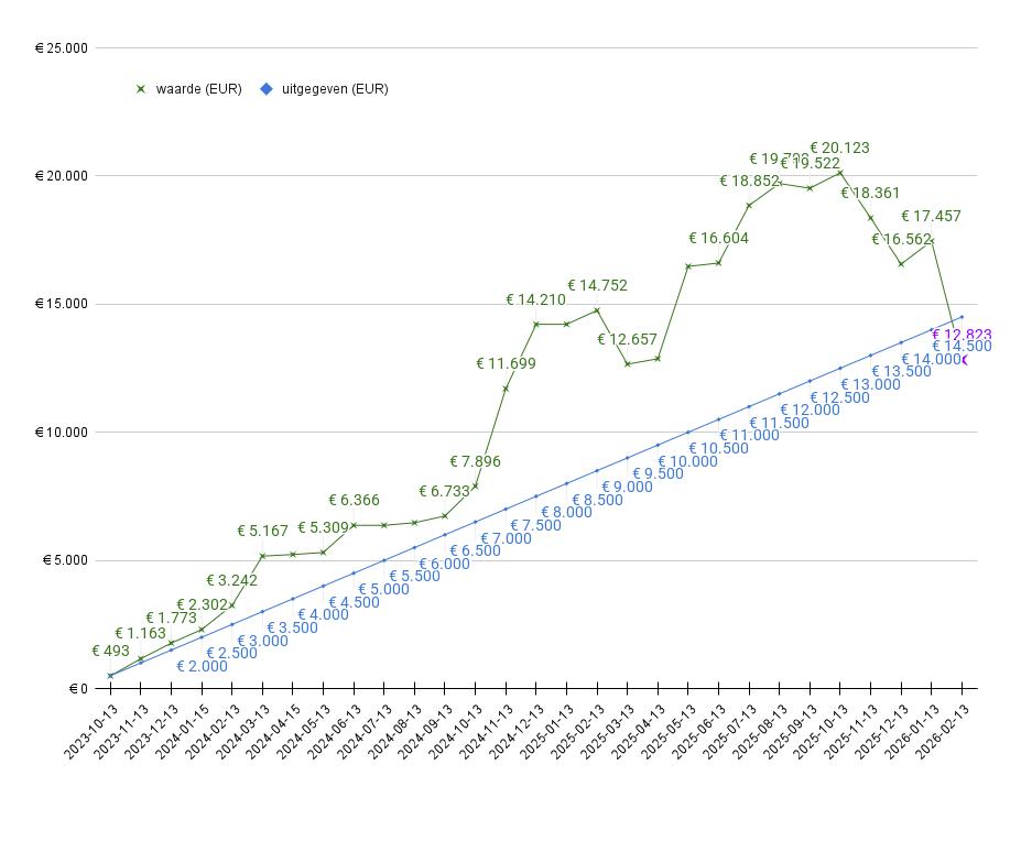 In deze periode bouwden we een tegoed van 0,23033056 bitcoins op, met een totale waarde van 12.823 euro. Het rendement van Satoshi's rekening bedraagt (12.823-14.500) / 14.500 = -11.6%. Na een lange periode van winst staan we door de daling van deze maand nu 11,6% in de min. Juist dit moment laat de kracht van consistent opbouwen zien: we kopen nu meer Bitcoin voor hetzelfde bedrag, wat de basis legt voor herstel op de lange termijn.