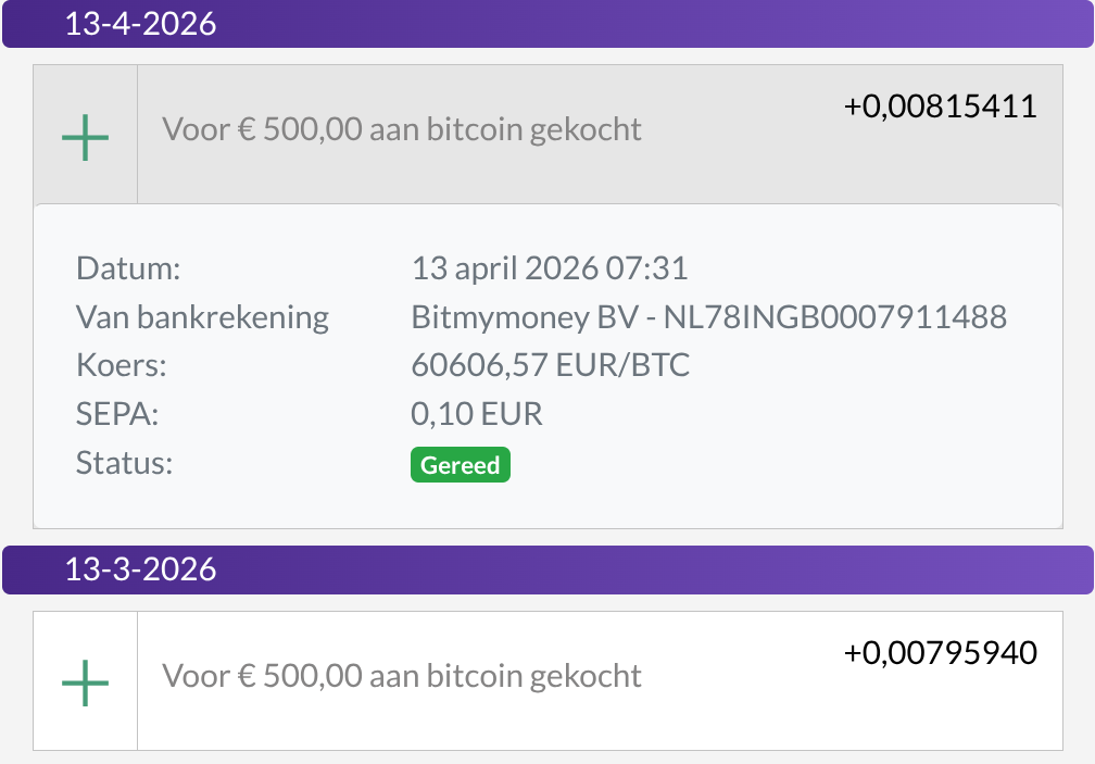 Let op: Bitcoin kent risico’s en valt niet onder het depositogarantiestelsel van de overheid. Bitcoinsparen betekent meer Bitcoin verzamelen in de tijd.