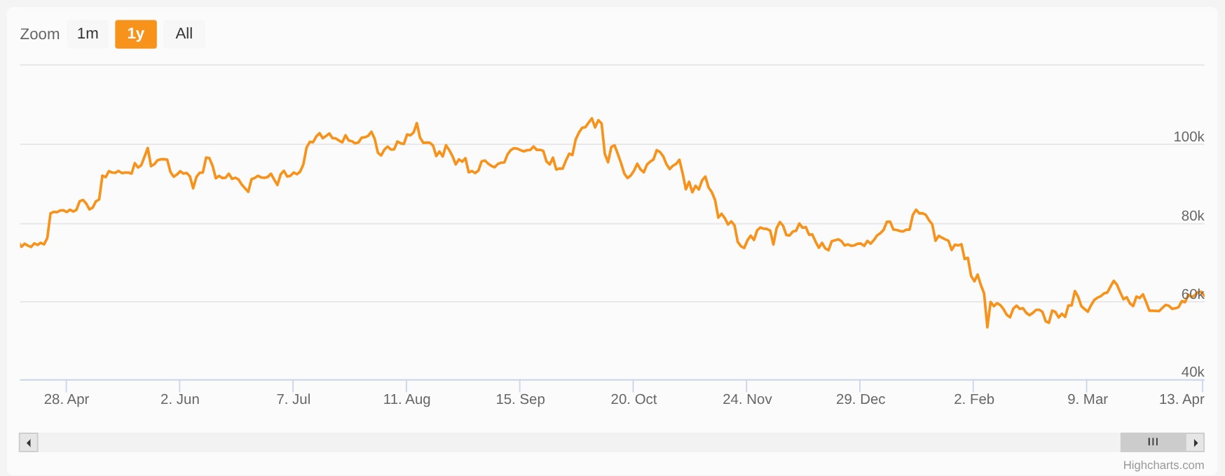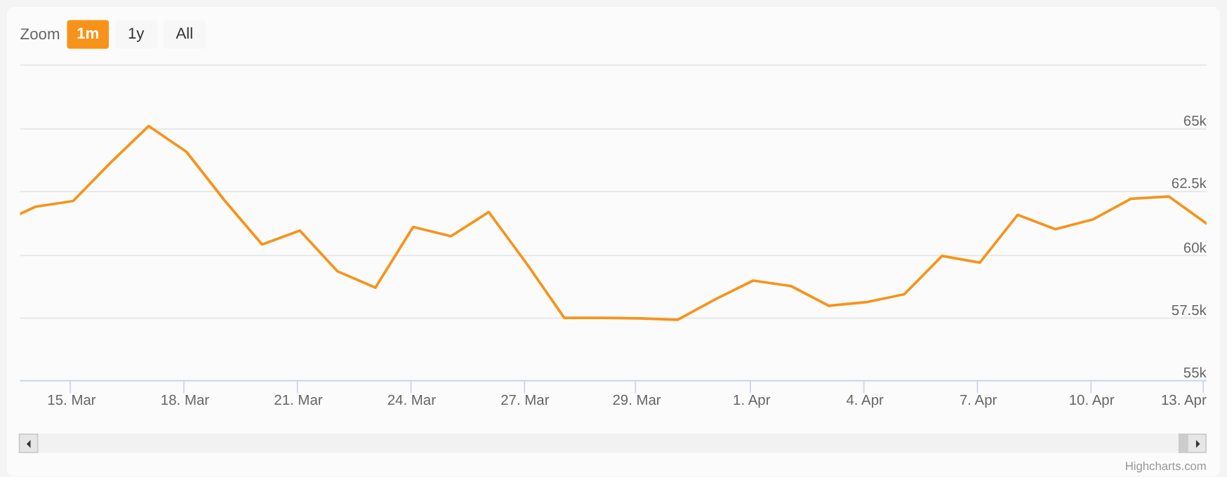 De koers stond deze maand op € 60.607, dat is 2,4% lager dan een maand geleden. In de grafiek hieronder zie je de koers van de afgelopen maand.