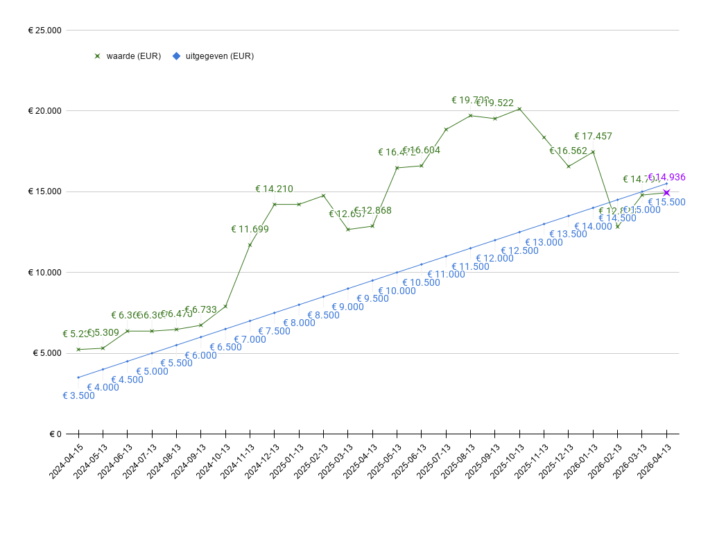 De waarde beweegt mee met de koers, stabiel rond het ingelegde bedrag. De basis voor de lange termijn wordt elke maand sterker.
